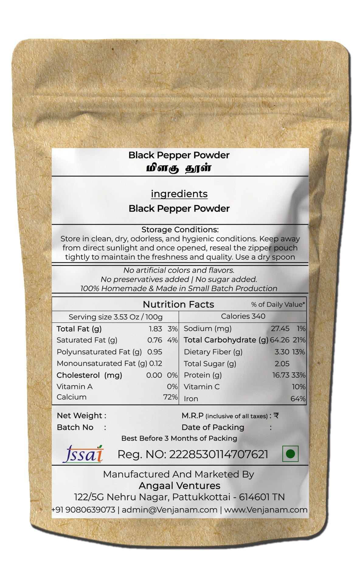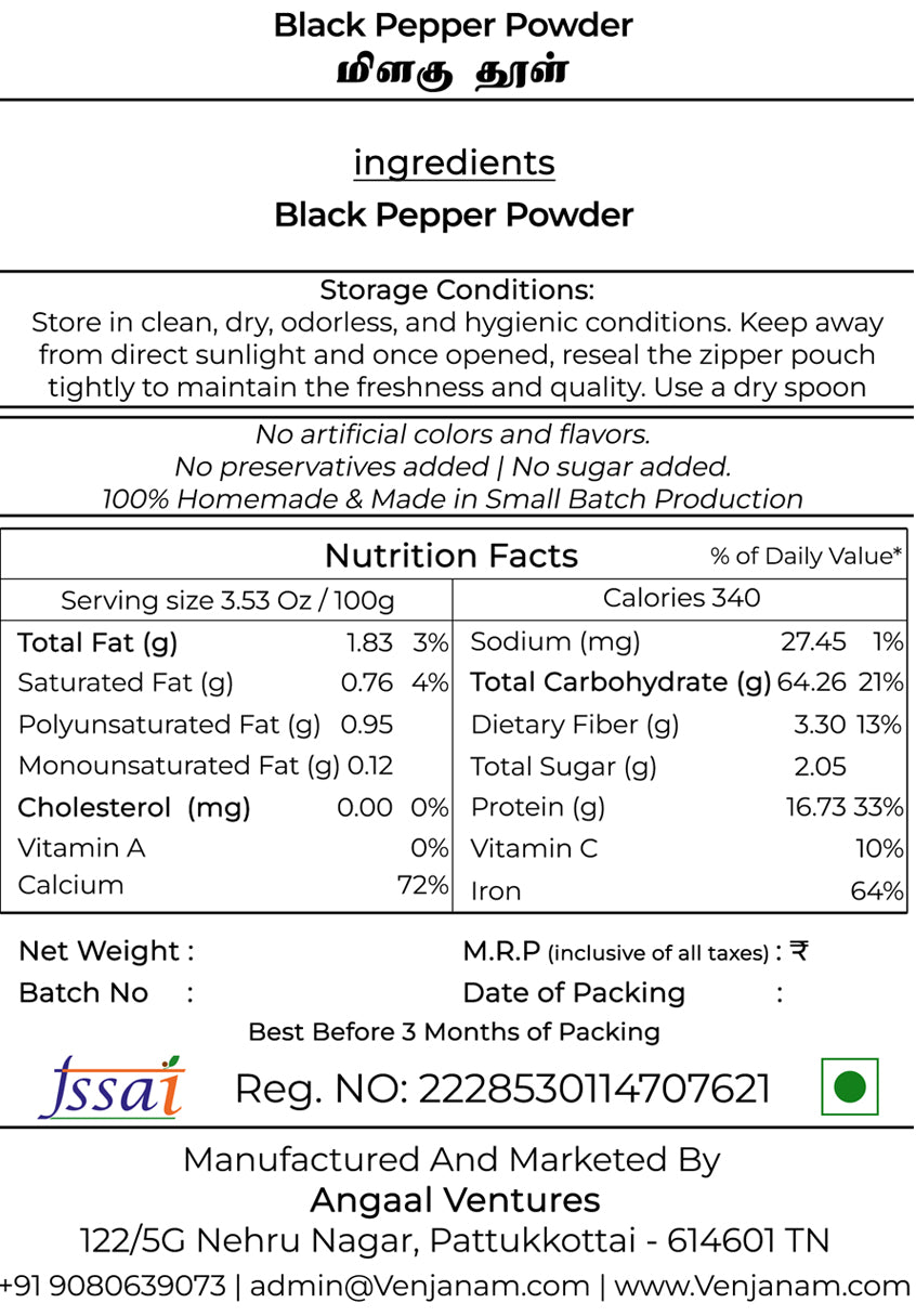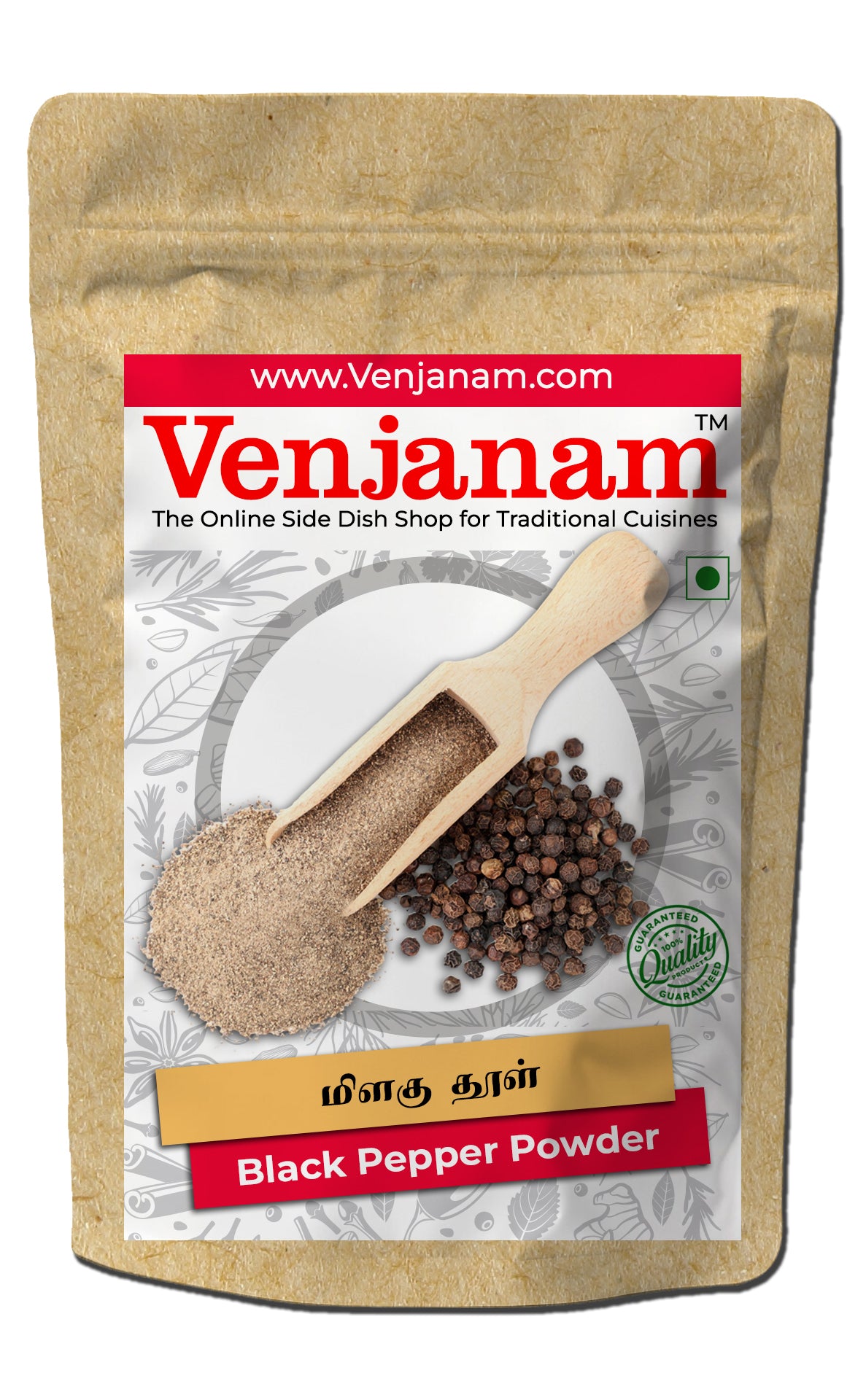 வெஞ்சனத்தின் மலபார் கருப்பு மிளகுப் பொடியின் துணிச்சலான, மண் சுவையான சாரத்தை உங்கள் சுவை மொட்டுகளுக்குள் எழுப்புங்கள்! மிகச்சிறந்த தரமான மலபார் மிளகுத்தூள்களிலிருந்து பெறப்பட்டு, கவனமாக வெயிலில் உலர்த்தப்பட்டு, அரைக்கப்பட்டு, எந்த உணவிற்கும் ஒரு தீவிரமான, நறுமணப் பஞ்சை வழங்குகிறது.