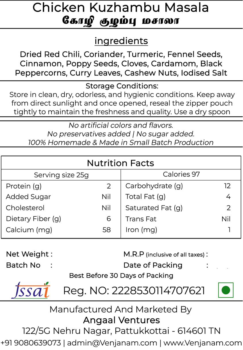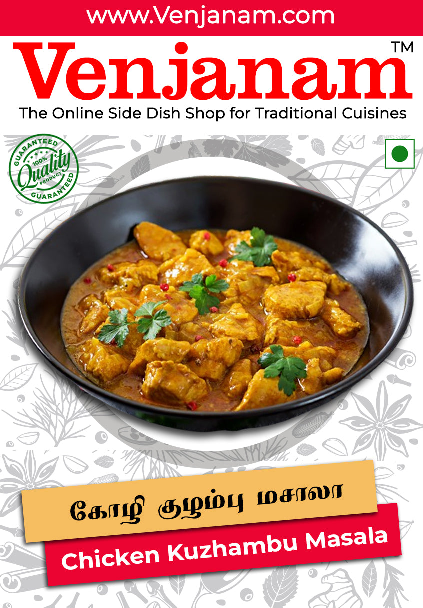 வெஞ்சனம் கோழி குழம்பு மசாலா கொண்டு, பாரம்பரிய தென் இந்திய கோழி குழம்பின் மணம், காரம், சுவை ஆகியவை உங்கள் சமையலறையிலேயே கிடைக்கும்.