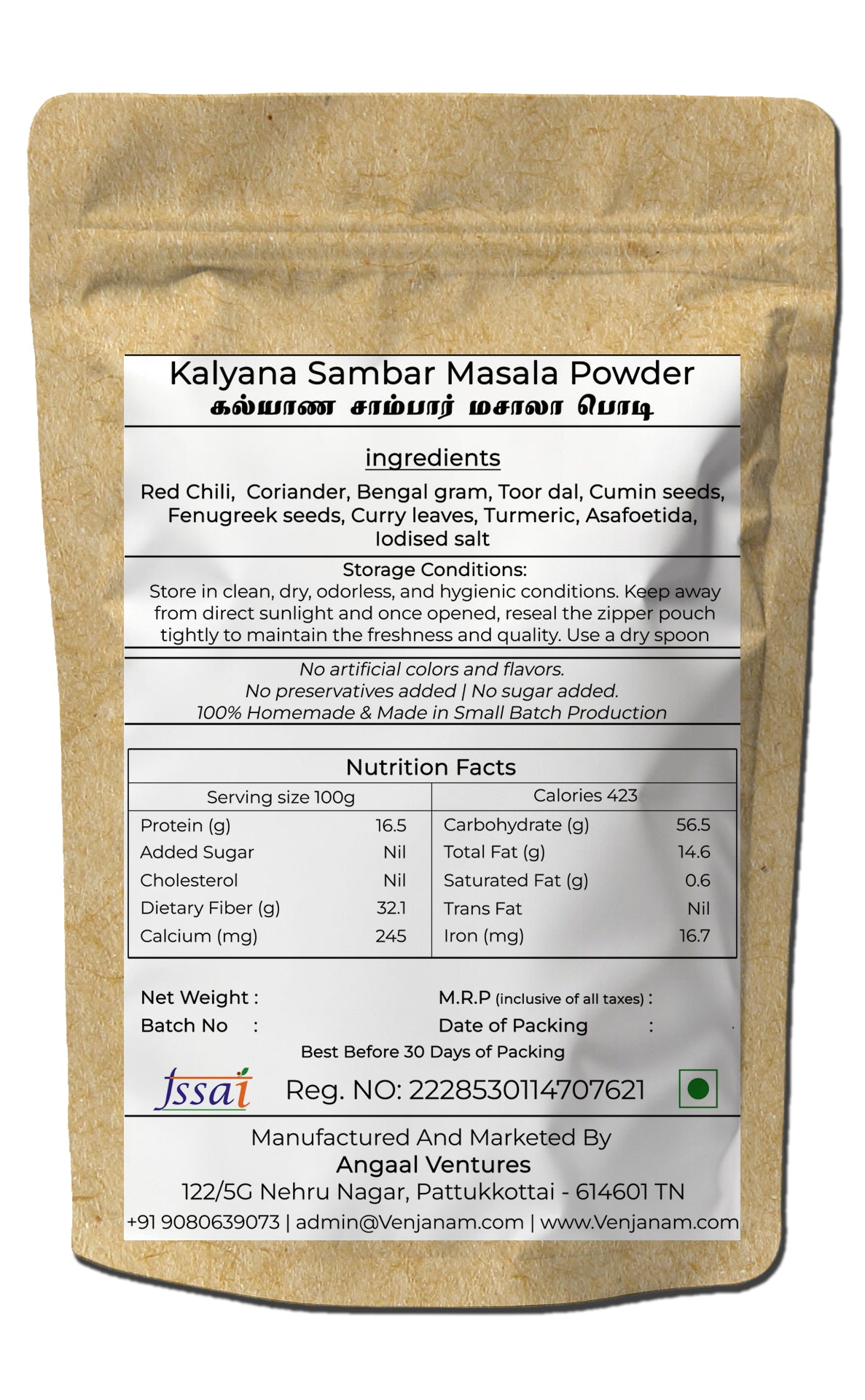 தென்னிந்திய கோயில் மற்றும் திருமண விருந்துகளின் உண்மையான சுவையுடன் — நறுமணமுள்ள, ஆரோக்கியமான மற்றும் ஆழ்ந்த திருப்திகரமான — வெஞ்சனம் கல்யாண சாம்பார் மசாலாப் பொடியுடன் — உங்கள் அன்றாட உணவை உயர்த்துங்கள்.