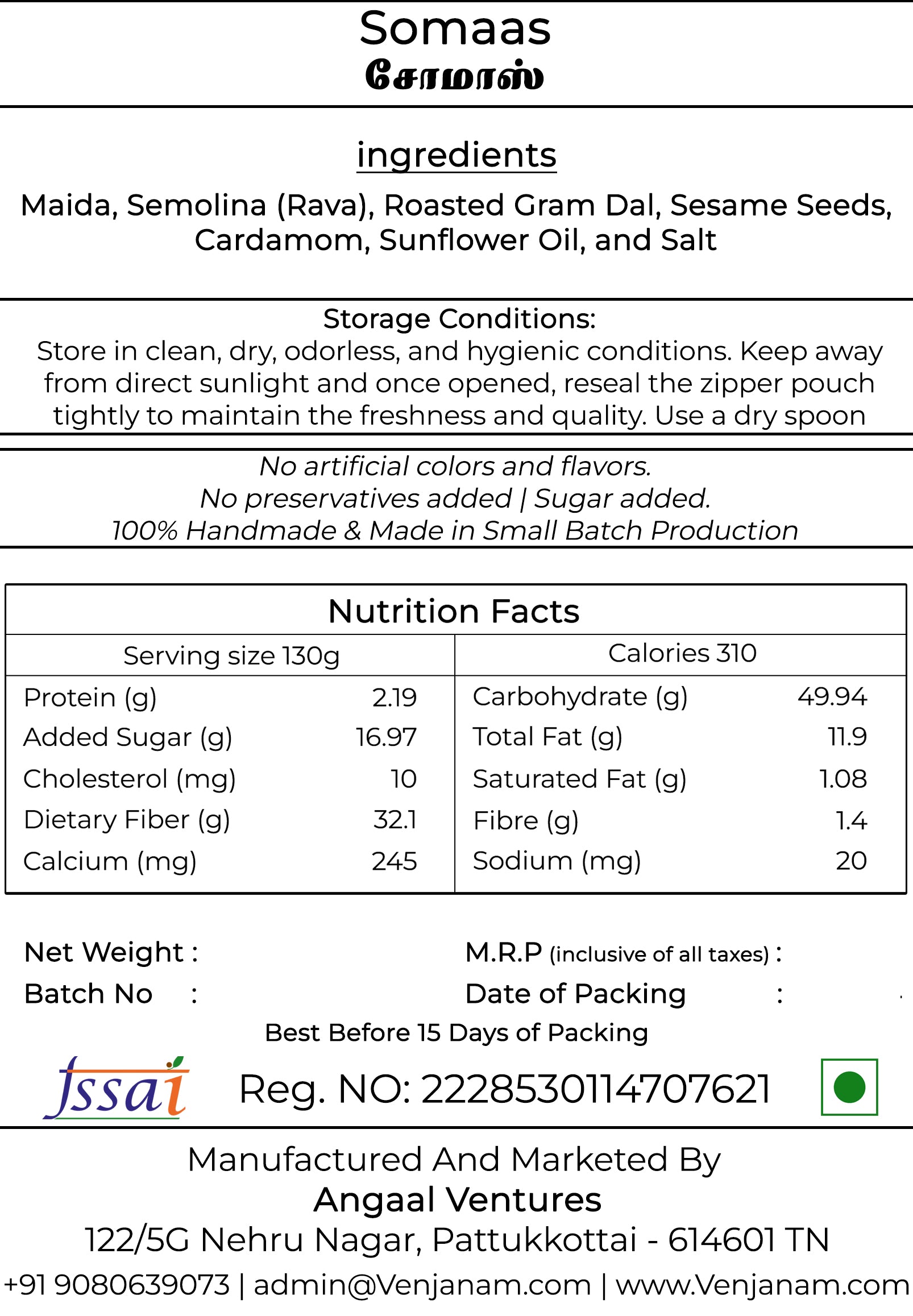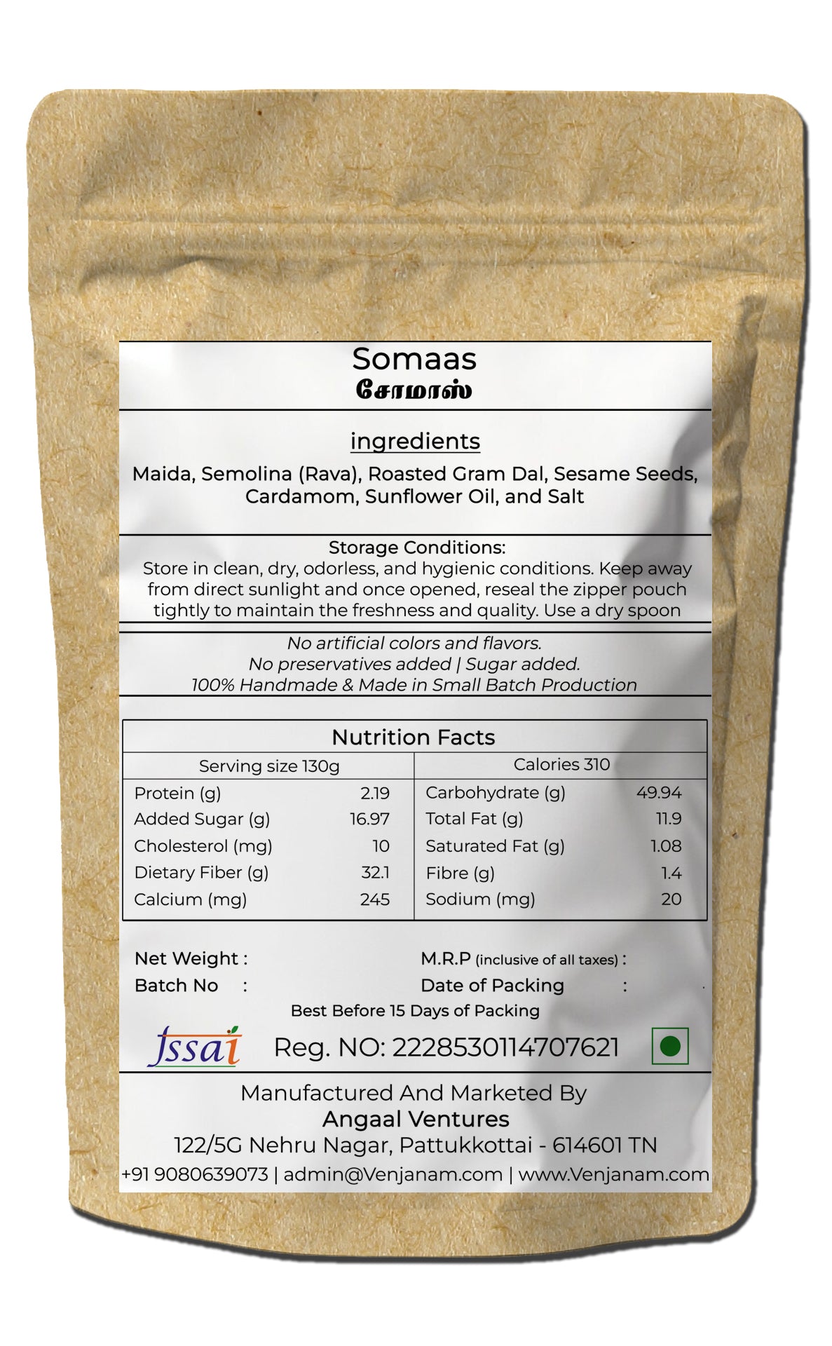 • 100% Handmade & Pure: Somasaa is made from premium maida, semolina (rava), roasted gram dal, sesame seeds, aromatic cardamom, sunflower oil, and salt.