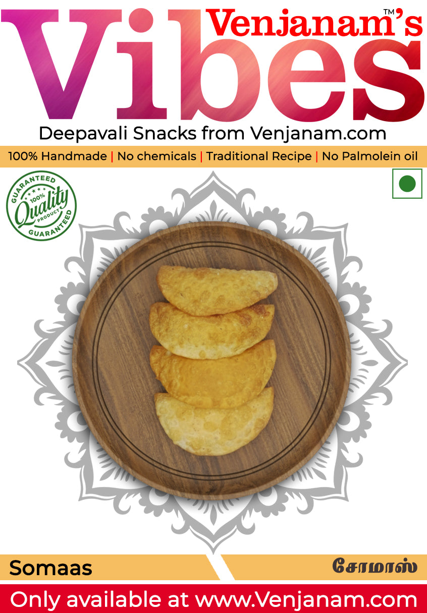 QBring home the authentic taste of Tamil Deepavali with Venjanam’s Somasaa—a classic festival pastry, hand-prepared in small batches for freshness and heritage flavor. Each Somasaa is soft, crispy, and filled with nostalgic goodness, crafted to be the perfect festive snack for celebrations and family gatherings.