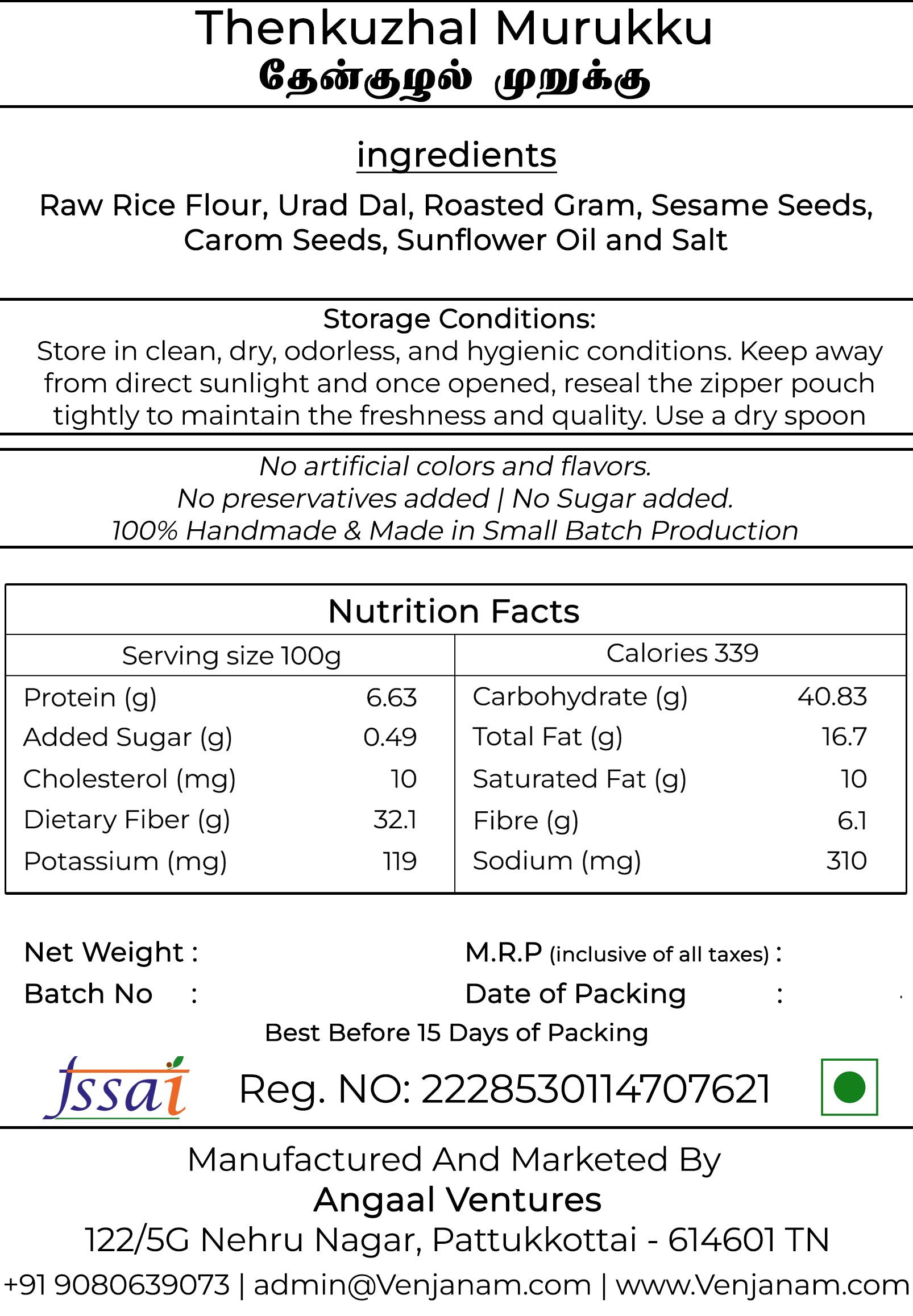 Enjoy the irresistible crunch of Venjanam’s Thenkuzhal Murukku, a timeless South Indian Deepavali snack made with 100% natural ingredients and village-style expertise. Each murukku is handcrafted in small batches—just like grandma’s—guaranteeing crispy texture and authentic festival flavor.