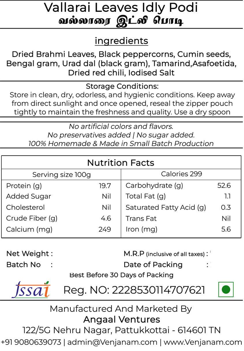 வெஞ்சனம் வல்லாரை இட்லி பொடி – மூளைச் செயல்பாட்டை மேம்படுத்தும் அசல் தென்னிந்திய மூலிகை மசாலா கலவை