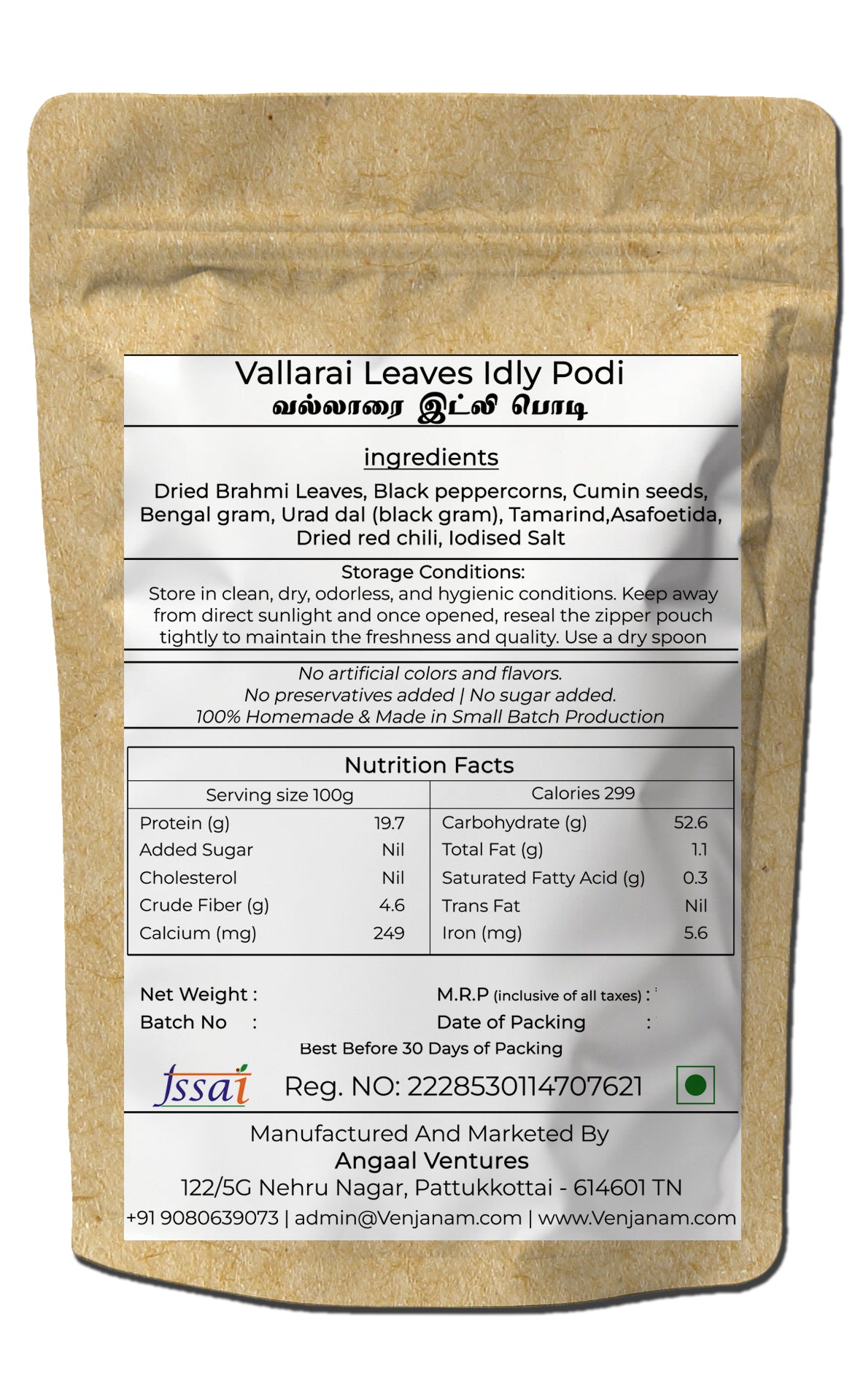 • அசல் மூலிகை சுவை – வல்லாரை இலைகளை நிழலில் உலர்த்தி, பருப்புகள் மற்றும் மசாலாக்களுடன் பாரம்பரிய முறையில் சேர்த்து தயாரிக்கப்பட்டது.