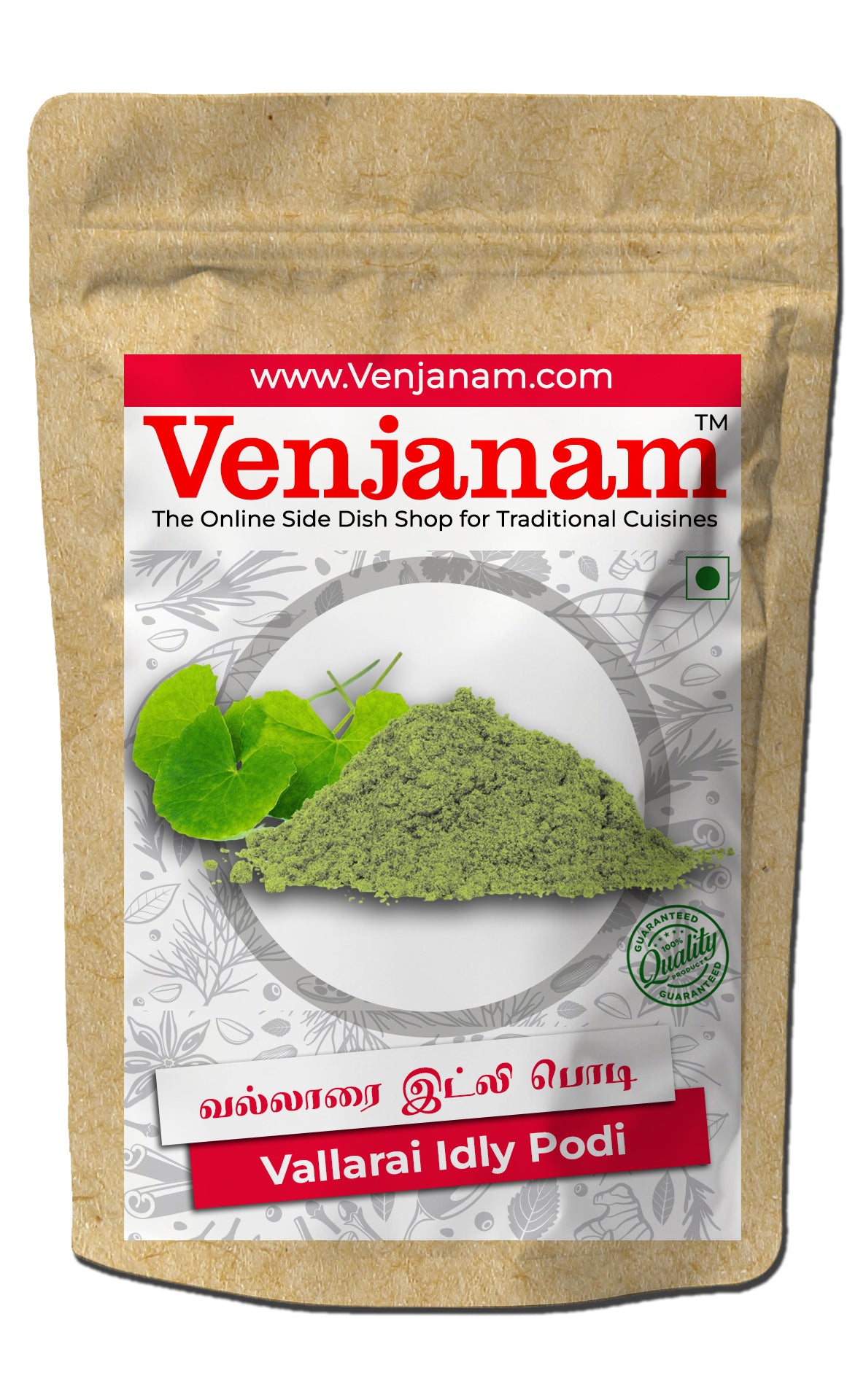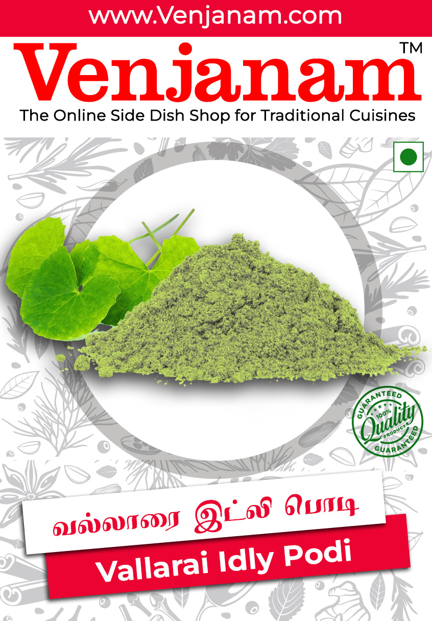 பாரம்பரிய தென்னிந்திய சுவையும், சக்திவாய்ந்த மூலிகை நலன்களும் ஒருங்கே கிடைக்க வெஞ்சனத்தின் வல்லாரை இட்லி பொடி உதவும். தமிழ்நாட்டின் பாரம்பரிய சமையல் முறையில் தயாரிக்கப்பட்ட இந்த மணமிக்க பொடி, சத்துகள் நிறைந்த வல்லாரை இலைகள் (பிராமி) மற்றும் உயர்தர பருப்புகள், மசாலாப்பொருட்கள், பசுமையான கீரைகள் இவற்றை ஒருங்கிணைத்து உருவாக்கப்பட்டு, ஆரோக்கியம் நிறைந்த சுவையான துணை உணவாக இட்லி, தோசை, சாதம் ஆகியவற்றுடன் கலந்துண்ண பொருத்தமானதாக உள்ளது.